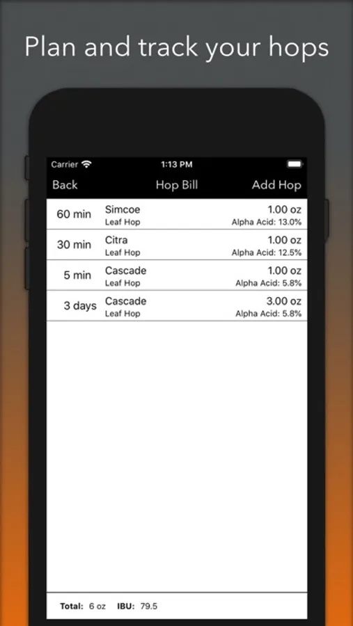 • As you add grains or hops Brew Log instantly updates estimated gravity, color, and bitterness. Great for building recipes on the go.