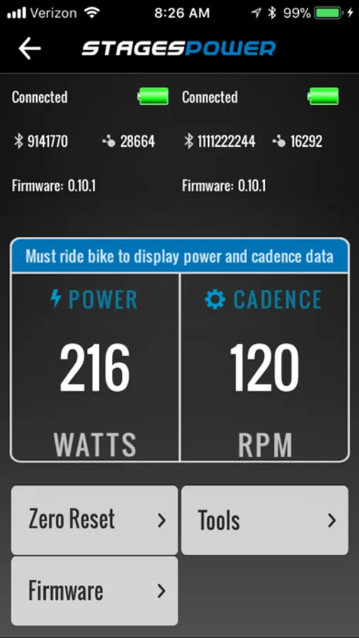 Maximize your Stages Cycling Power Meter performance. Utilize the app to quickly display power and cadence values, perform a zero calibration to ensure accurate measurements, update the firmware with the latest features and functionality, and set up left/right capabilities for compatible power meters.