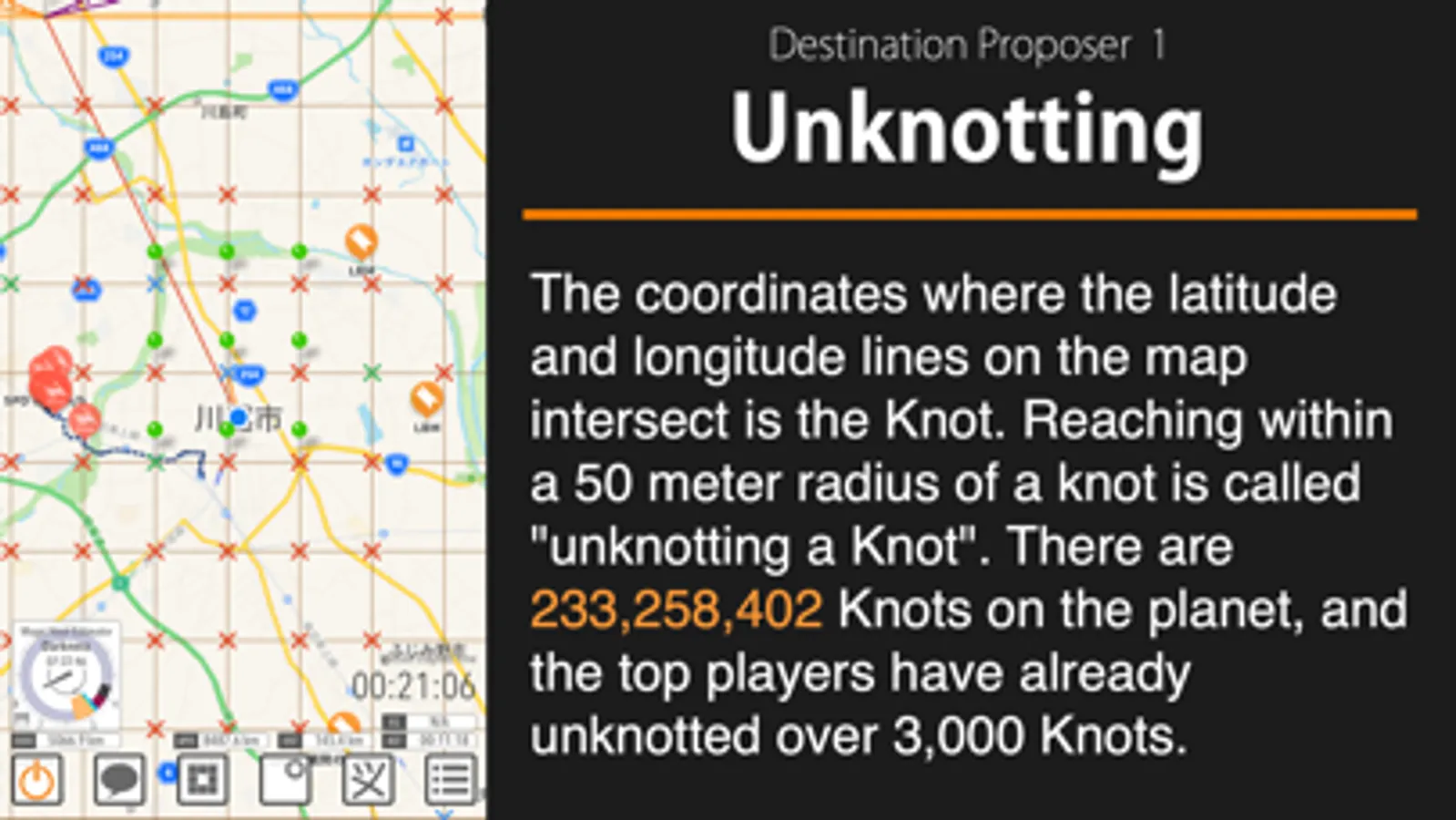 The intersection of a grid of latitude and longitude lines drawn every 1/60th of a degree is called a knot. There are 233,258,402 knots on the entire globe. The objective of Unknotting mode is to reach a circle with a radius of 50 meters centered on the knot.