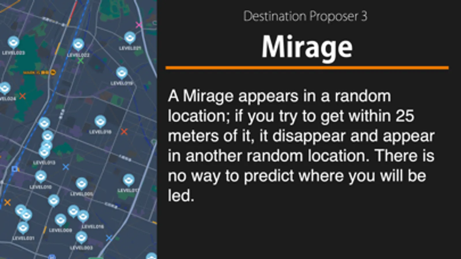 Mirages are a series of randomly generated coordinates. A Mirage initially appears at a distance of about 1 km from your location, but disappear when you attempt to approach within 25 meters, and then move to another location about 1 km away. The Mirage's coordinates are randomly generated, so there is no way to predict where it will lead you.