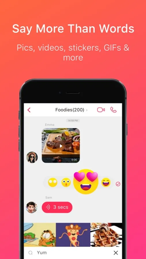 Send and receive pictures, voices, videos, locations, stickers, GIFs, and more 1:1 or in a group for up to 200 members.