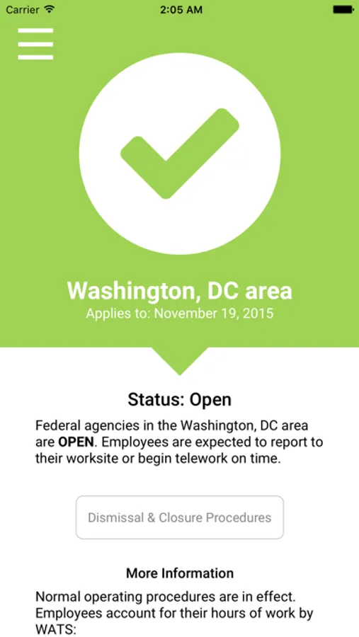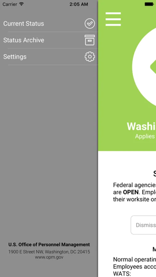 OPM DC Status is the official operating status app of the US Office of Personnel Management (OPM). This free app provides a real time look at the current operating status for Federal Government offices in the Washington, DC area.