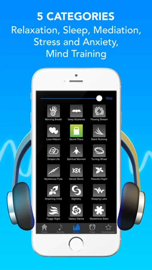 - 5 categories: Relaxation, Sleep, Meditation, Stress and Anxiety, Mind Training