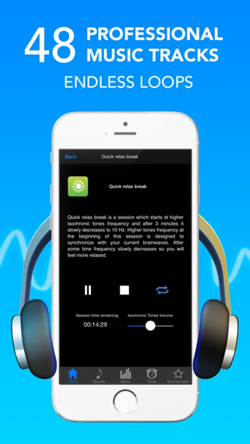 Brainwave Studio uses isochronic tones, widely regarded as the superior brainwave tone. Isochronic tones pulse at specific frequencies, and stimulate the brain to help you achieve your desired mental state. Unlike binaural beats, isochronic tones work through headphones or speakers. The isochronic tones are integrated into the backgrounds of beautiful, soothing melodies. Listen to the peaceful music while the tones automatically do their magic in the background.