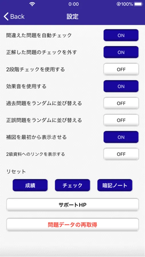 (自動チェック、ランダム、補図のON・OFF、成績リセット等)