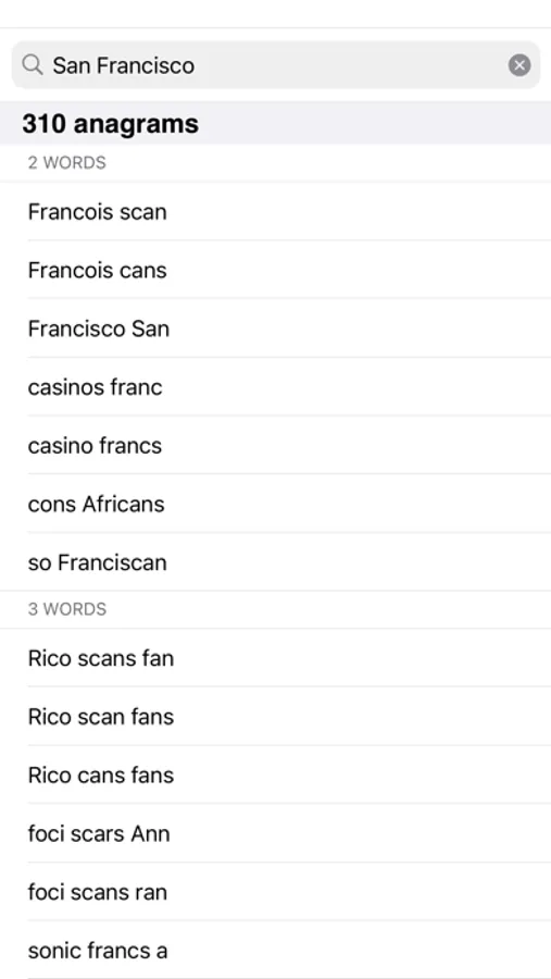 AG Anagram makes it easy to discover new anagrams of your own. Simply enter a word, phrase, or name into the search box and tap Search. AG Anagram will search for anagrams of the text you entered and display them in a scrolling list. Try anagramming your own name, or the names of friends and family. For more variety, try them with and without middle names.