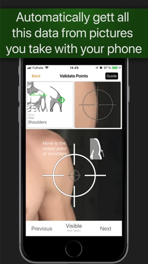 Get the measurements of all your body parts and muscle groups from pictures. Calibrated for accuracy, you can follow your body goals and track your physique in fractions of inches/centimeters.