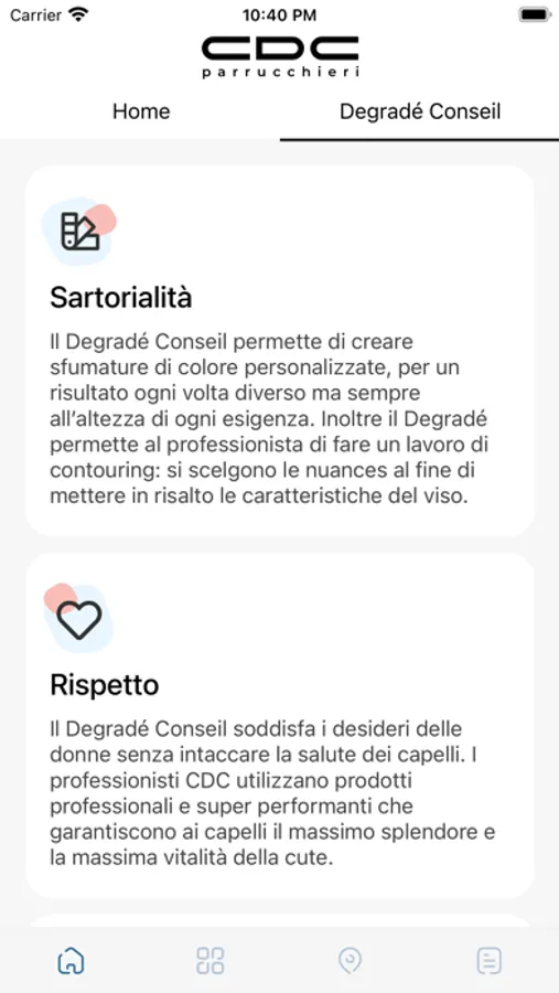 Da oggi il Centro Degradè Conseil offre un servizio totalmente nuovo. Con la nostra applicazione ogni cliente avrà la possibilità,grazie ad una comoda galleria fotografica, di visionare il nostro innovativo metodo di taglio.