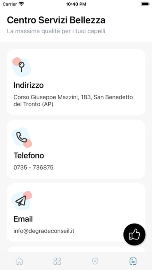 Abbiamo inoltre deciso di prestare particolare attenzione alla geolocalizzazione, in modo tale da permettere a chiunque di poter trovare il salone più vicino a se, ricevere indicazioni stradali per raggiungerlo, o eventualmente contattarlo telefonicamente.
