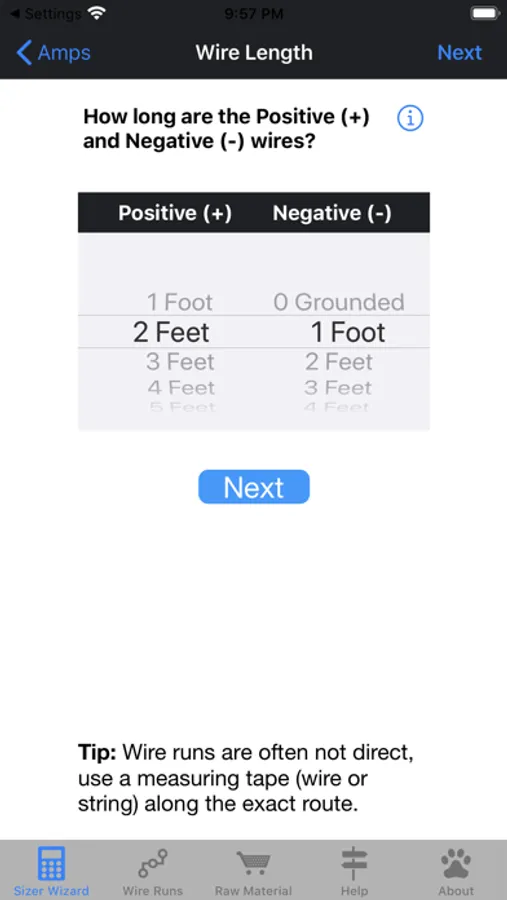 - Choose from three methods of entering wire lengths for fast entry including separate positive/negative wire lengths (when different or negative is contact grounded, like a starter)