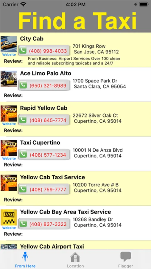 Taxi Flagger for Apple iPhone/iPad locates taxi and limo services based on you current location with a single click. It can also find services given a specific state and city showing your the address to give the taxi called from a complete list of services.