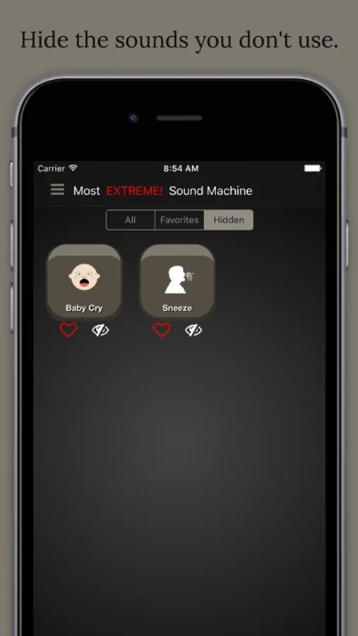 Awkward, Baby Cry, Baby Rattle, Bells, Bite Apple, Bugle, Burp, Buzzer, Coffee Maker, Car Alarm, Cha-Ching, Chainsaw, Charge, Harp, Horn, Cough, Danger, Dog Toy, Doorbell, Drum Sting, Explosion, Fan, Fart, Fire Alarm, Footsteps, Garbage Disposal, Gargle, Glass Break, Goat, Gong, Guitar, Hair Dryer, Harmonica, Horse, Ketchup Squirt, Knocking, Loser, Machine Gun, Mixer, Oh Yeah, OMG, Open Can, Pee, Plastic Bag, Losing Horn, Punch, Ray Gun, Rooster, Sad Trombone, Scream, Sigh, Sneeze, Streets, Sword, Tambourine, Toilet Flush, Train, Tugboat, Warning, What, Whip, Witch, WTF?, Yeah