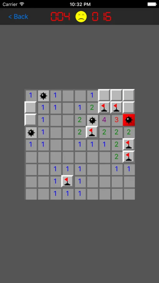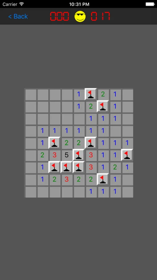 Clear the minefield by tapping each square without setting off a mine. Trip one off, you lose. Each numbered square tells you how many mines touch that square (the 4 flat sides and 4 corners).
