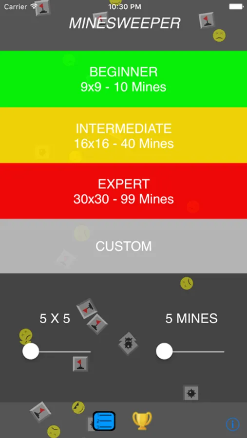 Then there is a custom mode where you can have a minimum of a 5x5 field with 5 mines all the way up to a 60x60 field with 1200 mines!