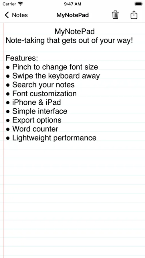 Want to change the font size? Just pinch-to-zoom! Want to key the keyboard out of the way? Push it off of the screen! Want to go to another note? Turn the page with a flick of your finger! TextPad was built to be the best way for you to take notes on the go.