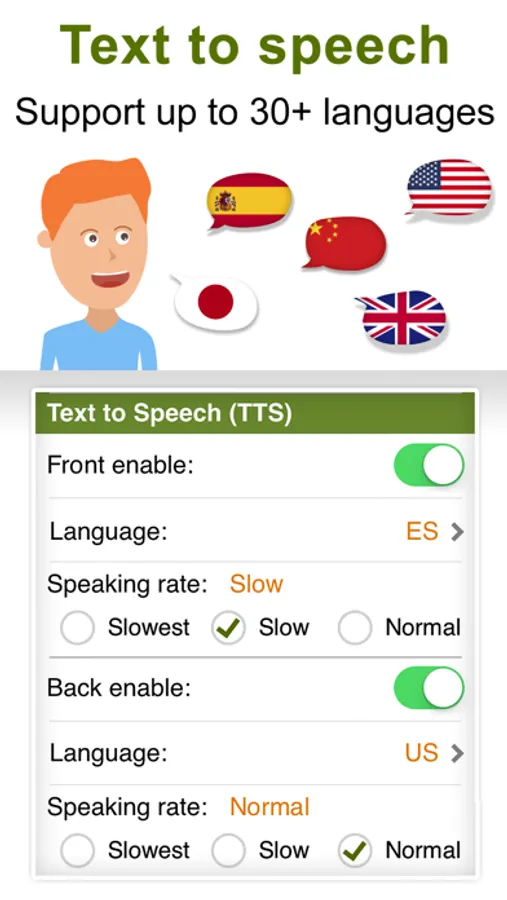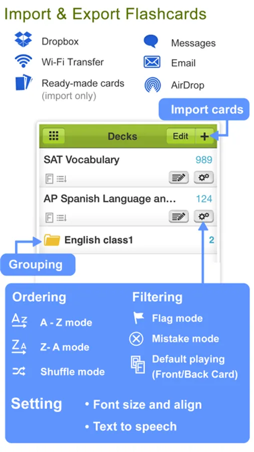- Make your own customize flashcard decks. (Supports text, photo and audio both 2 sides of card).