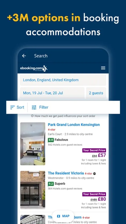 - Search by city, place of interest, hotel name or nearby accommodations.