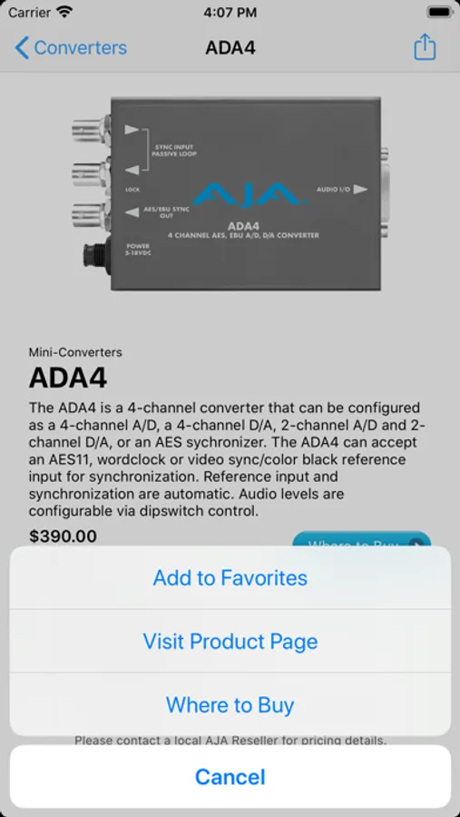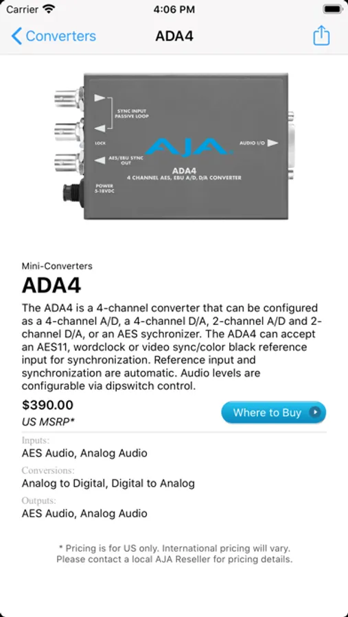 In addition, you can discover where to buy the AJA Mini-Converter of your choice anywhere in the world by selecting "Where to Buy" from the product detail listing.