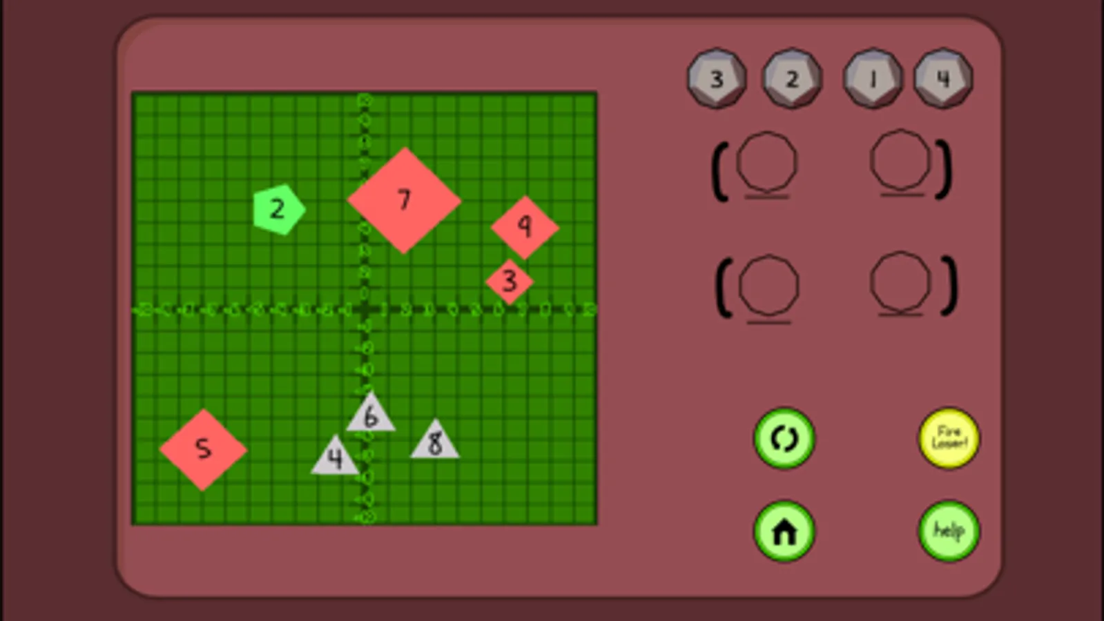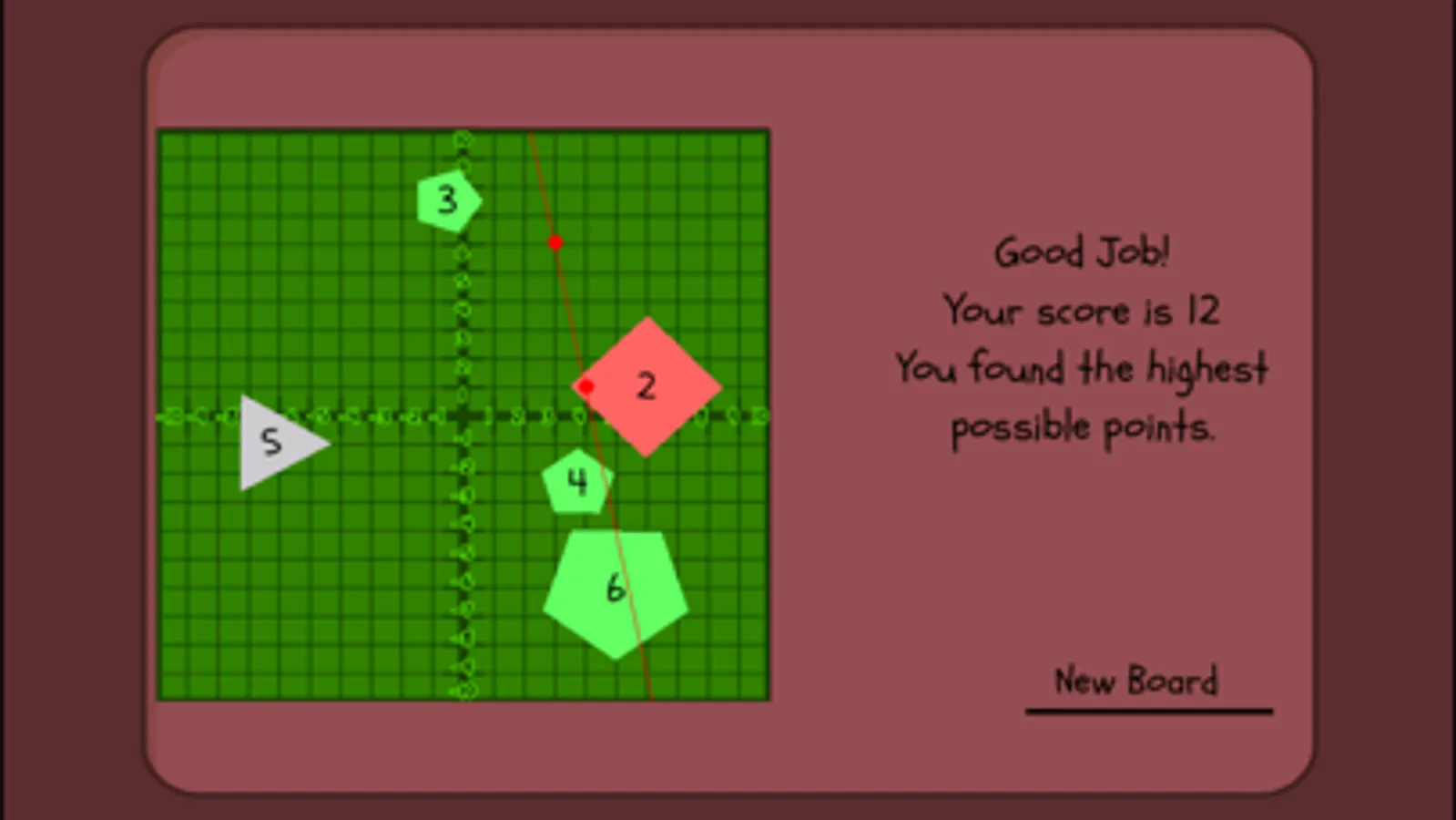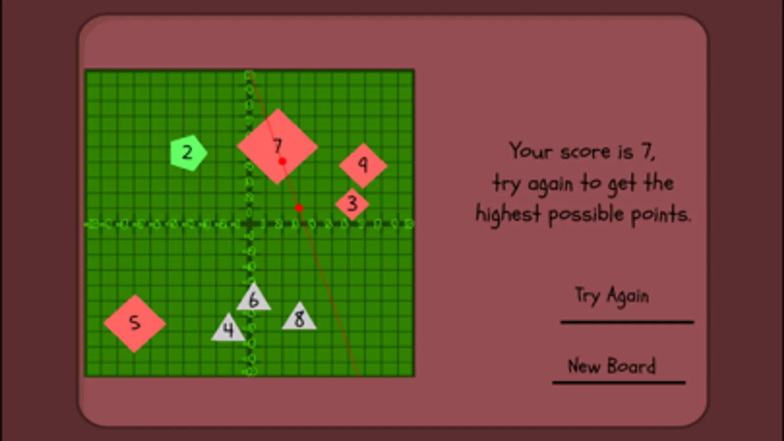 Players will race (Multiplayer mode using Bluetooth) or practice (single player mode) in identifying two locations (ordered pairs) on the grid, drawing a straight line from one edge of the gameboard to the other passing through the two locations identified, scoring points for each shape that his or her line touches or through which his or her line passes that are located in all four quadrants of the coordinate grid.