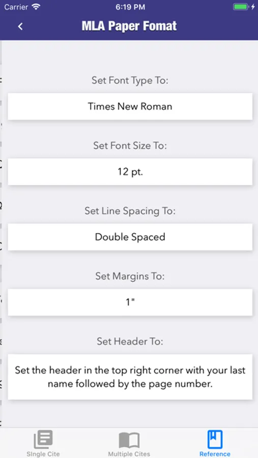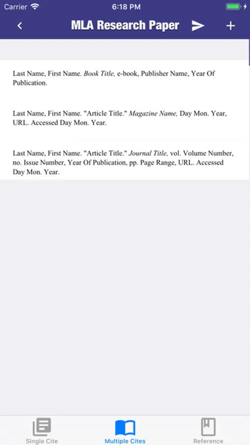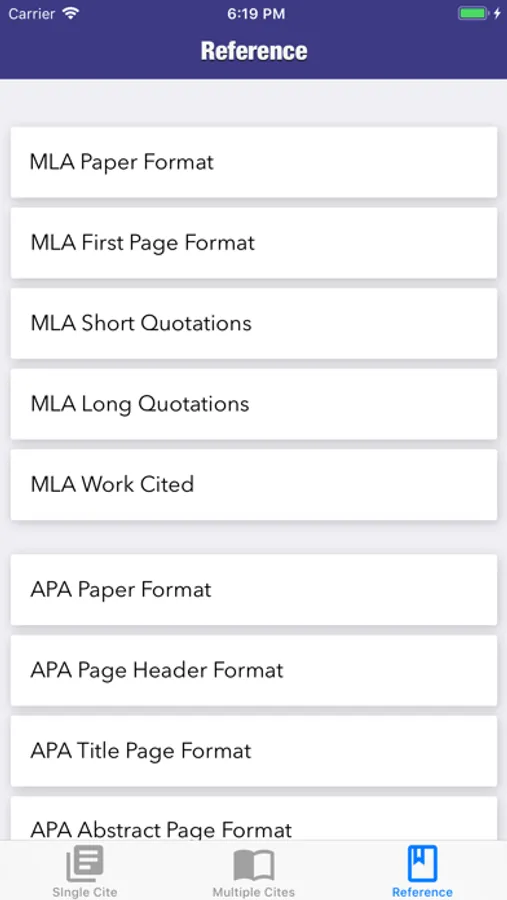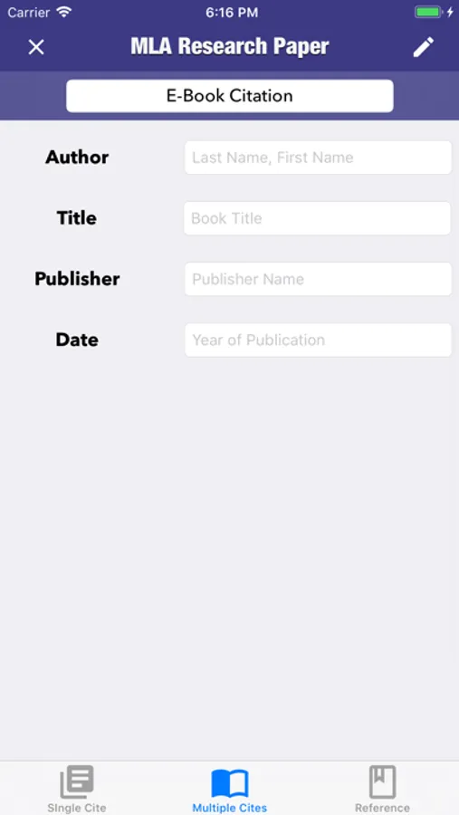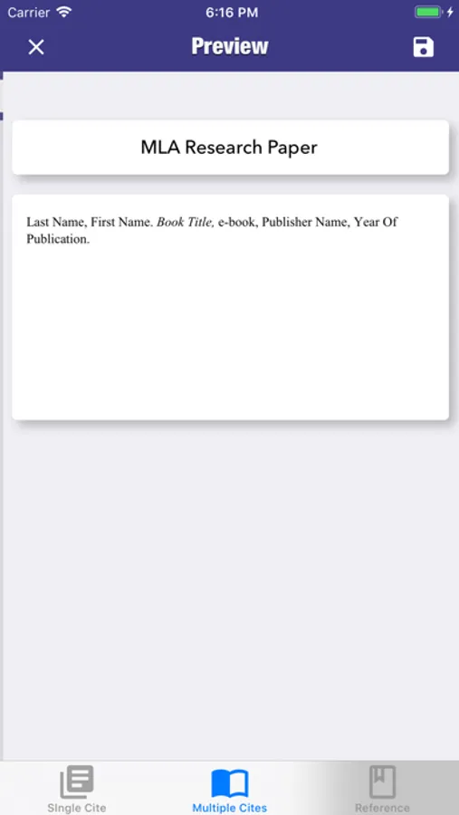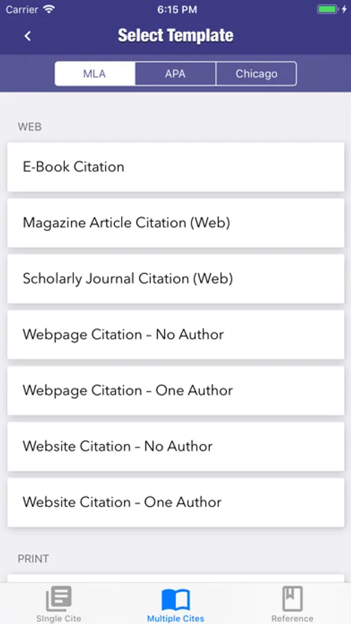 Cited is the easiest citation creation app. Simply select your paper format and your template, enter the information, and press create. Now with a section to create and save multiple citations.