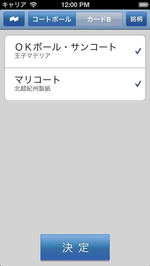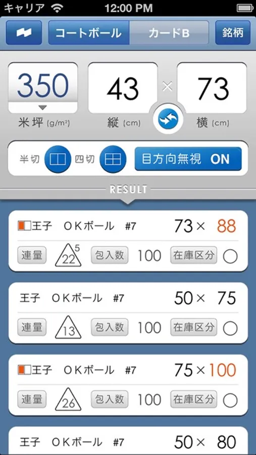 コートボール、カードBの寸法検索アプリです。