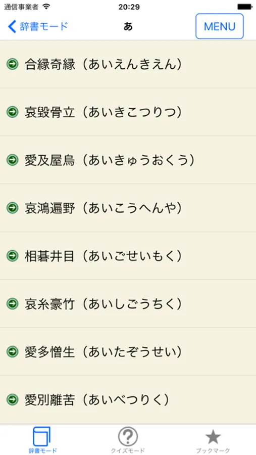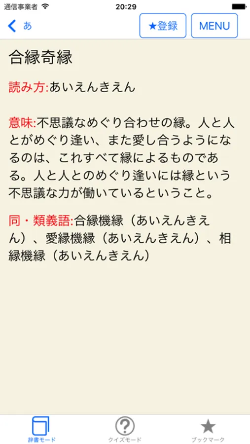 それぞれ、「辞書モード」と「クイズモード」を用意しました。クイズモードでは、意味から成語を知るための「逆引き辞典」や「書き取り練習」のように使える他、みんなが集まった時にワイワイと雑学知識を披露しあって楽しむこともできます。
