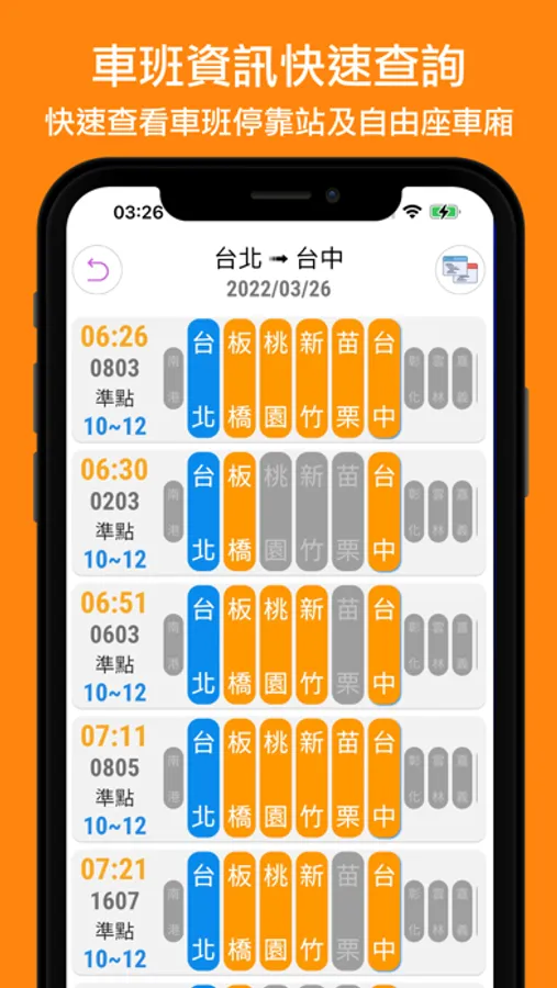 - 自由座車廂資訊,在時間、車次下方,以車廂範圍呈現,比如 10~12, 9~12等。