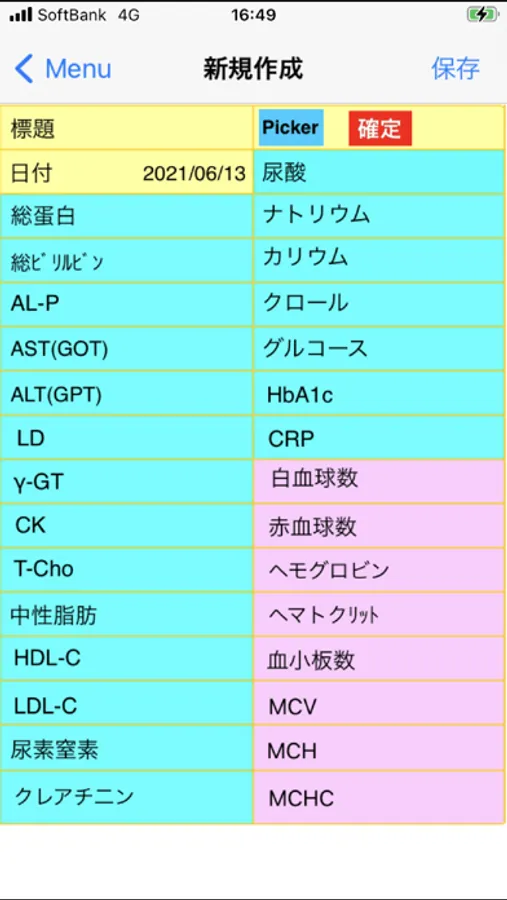 このアプリは、臨床検査(検体検査)のうち、生化学検査と血液学検査の各検査項目(一部)の数値データを入力・保存・編集し、グラフ表示することができます。また、メモも入力・保存・編集することができます。記録したデータを出力(メール送信)することもできます。日付は、DatePickerで入力しますが、入力しない場合は、保存時現在の年月日が自動的に記録されます。また、「保存」時に未入力欄に-1を自動的に補充します。-1はデータがないことを意味します(Google Chart APIの仕様)。Menu画面のテーブルは、日付の降順(新から旧)でソートします。