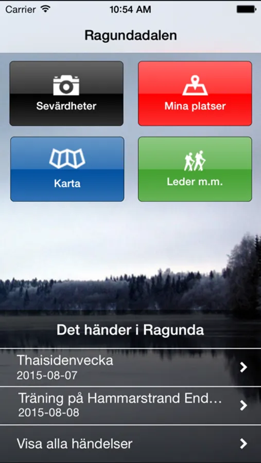 Genom evenemangskalendern håller du dig ständigt uppdaterad om vad som är på gång i Ragundadalen. I appen finns även vägbeskrivning till sevärdheterna samt evenemangen, för detta krävs tillgång till mobilnät.