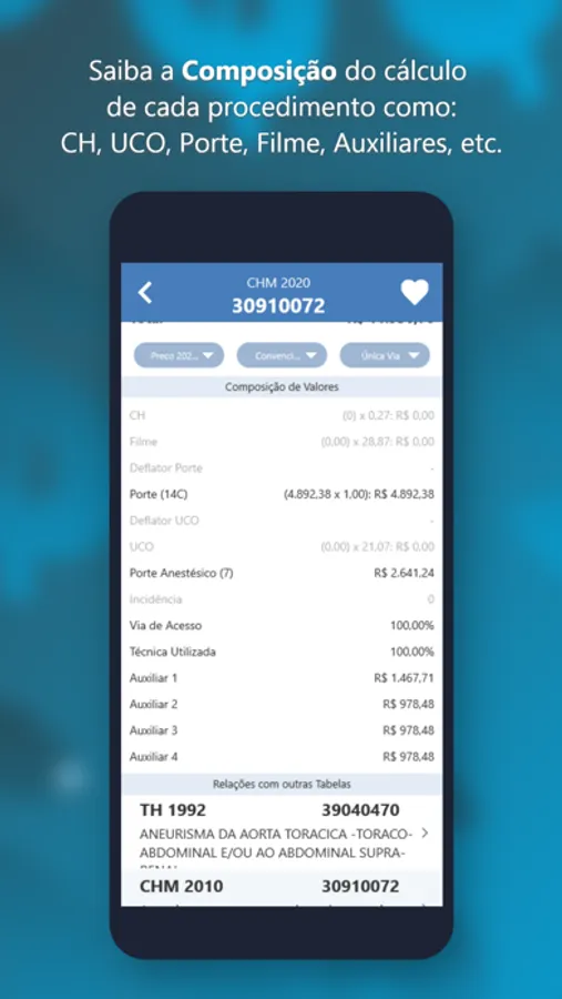 O aplicativo utiliza os parâmetros: CH, FILME, UCO, PORTE, PORTE ANESTÉSICO, DEFLATORES, considerando ainda o NÚMERO DE AUXILIARES, VIA DE ACESSO, TÉCNICA UTILIZADA e o tipo de procedimento na apuração do preço.