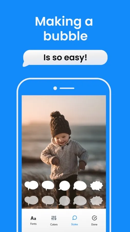 The flexibility of Bubble is limitless. Use different bubble styles such as thought, cloud, block or shock. Change the font and the color of your text. Add multiple bubbles to group photos. Share your creations with family and friends.
