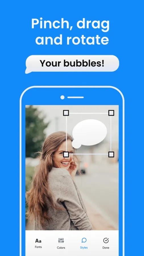 - Pinch, Drag, Rotate and Arrow adjustment technology to get your bubbles where you want them