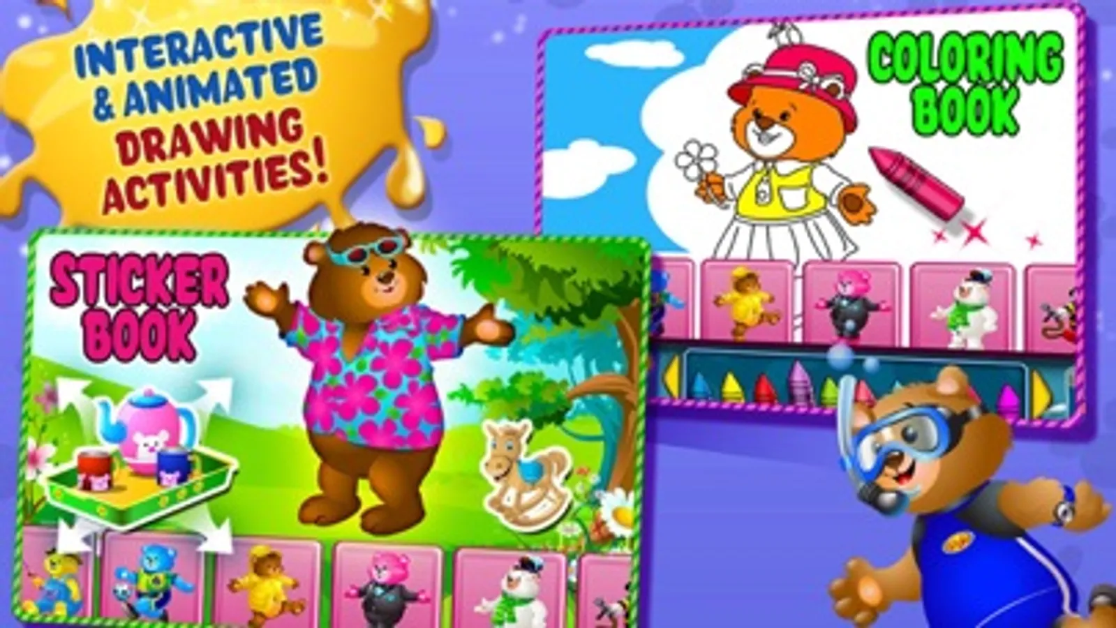 > Sticker Book - Interact with the adorable Teddy Bears on screen while you can finger paint with colors and fill areas with paint buckets.