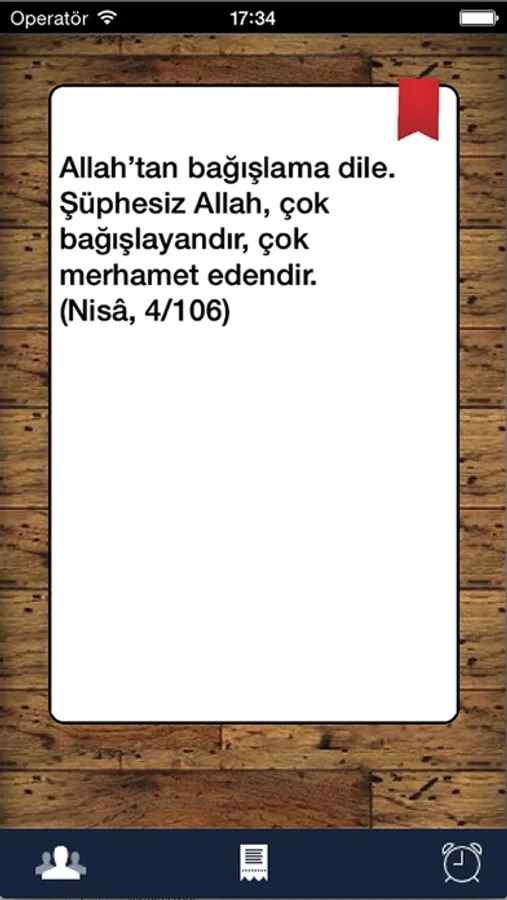 Her gün sizin için özenle seçilmiş çok sayıda ayetten birini görüntüler. Alarm özelliği sayesinde istediğiniz günlerde sizi günün ayeti ile uyarır. Her gün güzel bir ayetle uyanmak ve bu ayeti facebook, twitter, e-posta veya SMS ile sevdiklerinizle paylaşmak için yapmanız gereken tek şey uygulamayı ÜCRETSİZ olarak indirmek !. Birbirinden güzel 9 alarm sesi içerir. INTERNET BAĞLANTISI GEREKTİRMEZ!.