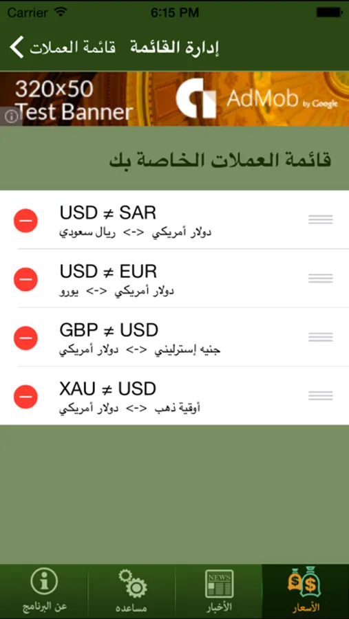 للدخول الى صفحة ادارة قائمة عملاتك قم بالضغط على زر 'تعديل القائمة'. و فهى الشاشة يمكنك فعل الاتي:-