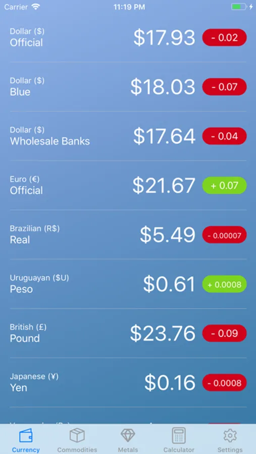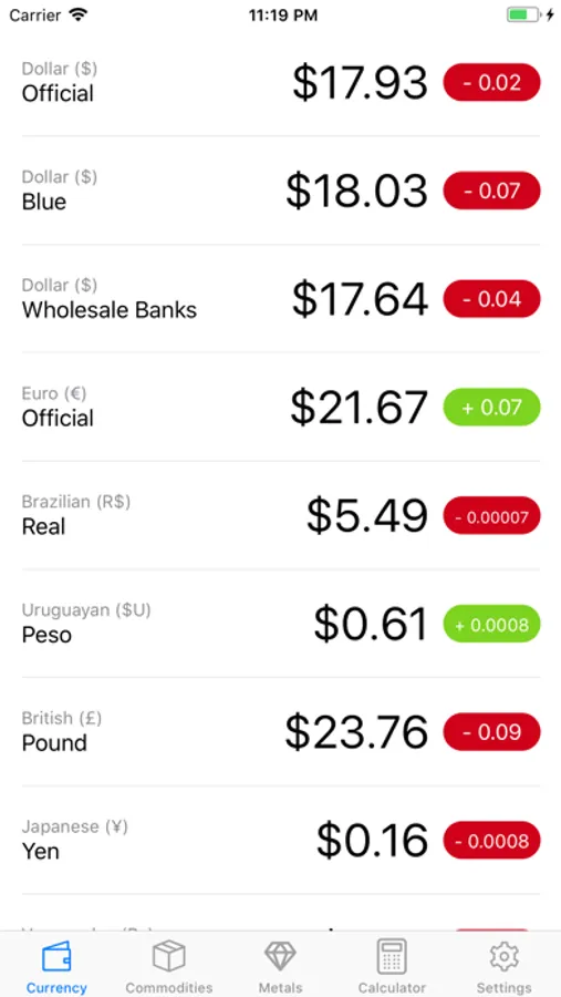- World wide currencies (Euro, Briish Pound, Austalian Dollar, Brazilian Real, Swiss Franc, Chinese Yuang, Emirates Dirham, Indian Rupee, Malaysian Ringgit, South African Rand, Argentinian Peso, Chilean Peso, Uruguayan Peso, Colombian Peso, Venezuelan Bolívar).
