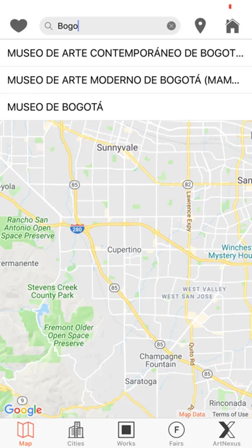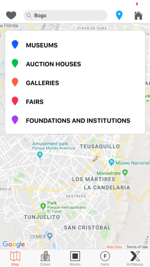 The Map View indicates the user's location and specifies where current exhibitions are being held in galleries, museums, fairs, etc; also find all the information and program.