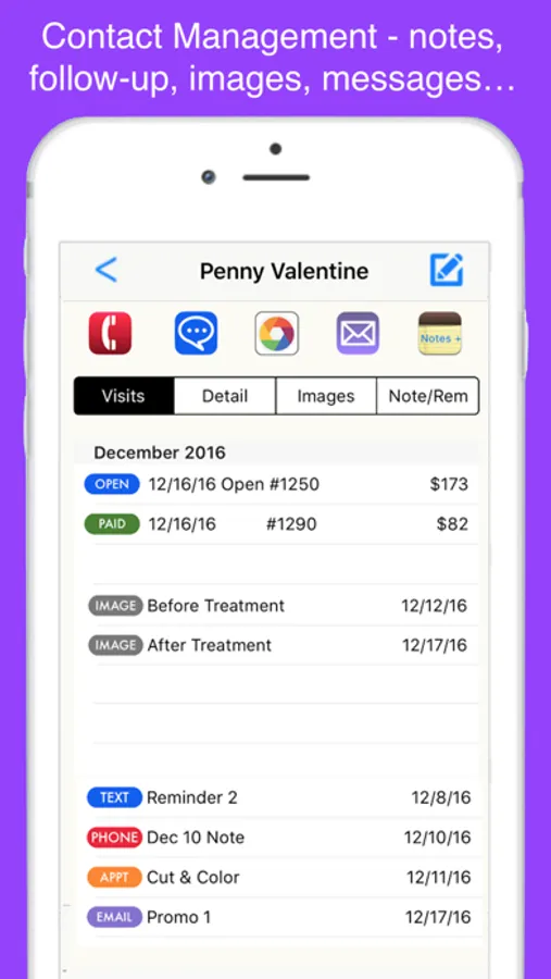 Client & ContactManagement - Store notes, images and track other communications with your clients and have the in app ability to call, text, email or map without leaving your app.