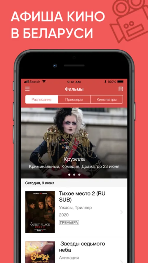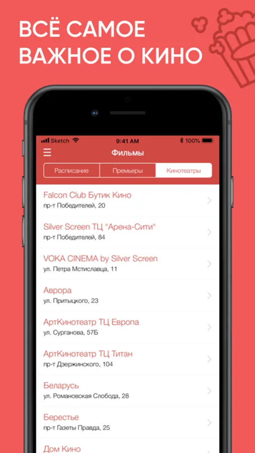 Приложение Афиша - ваш гид в мире кино Беларуси. В нем вы можете найти актуальное расписание кинопроката, информацию о кинотеатрах с телефонами и адресами, купить билет не выходя из дома.