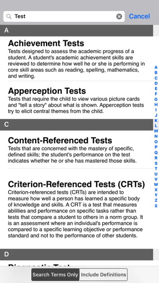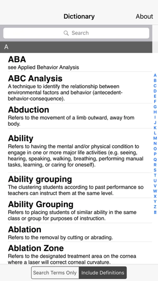 The NASET Special Education Dictionary gives you thousands of terms used in special education with their respective definitions and easy-to-understand explanations. This practical app is the most comprehensive dictionary available in special education. You can look up any definition by means of the main search or alphabetical search. If you work in the field of special education or are a parent of a child with special needs, you should have the NASET Special Education Dictionary in your app library.