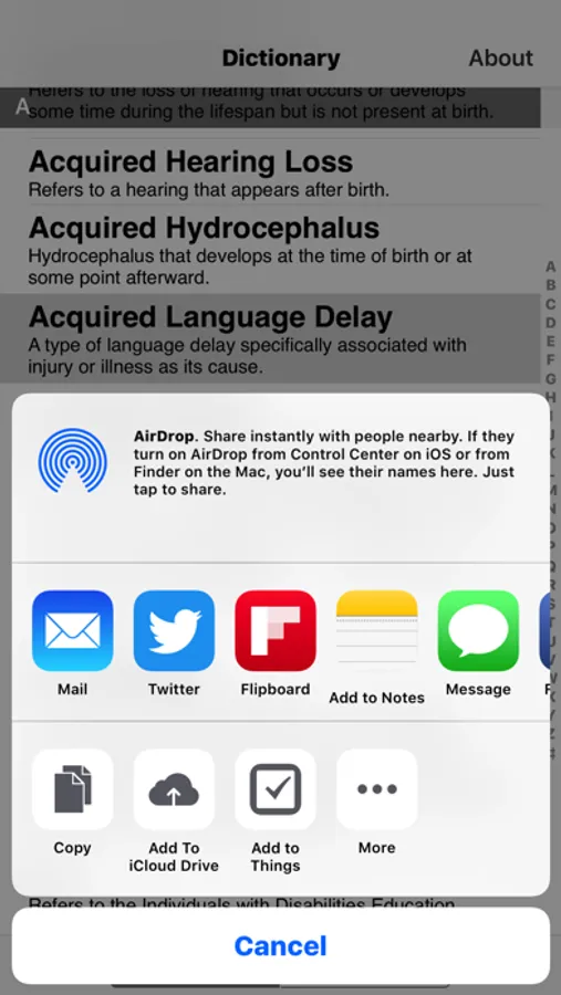 * Export terms and definitions by message, email, Facebook, Twitter and even copy to device clipboard
