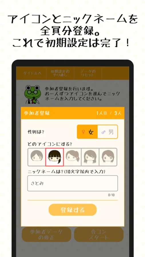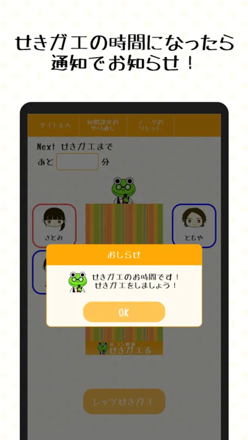 せきガエタイマーと参加人数を指定し参加者全員のニックネームとアイコンを登録。