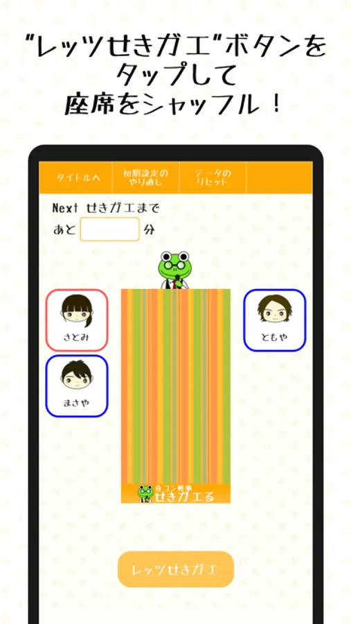 「レッツせきガエ」をタップで席をシャッフル!
