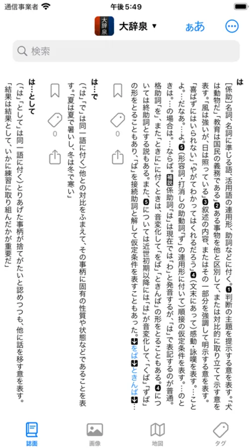 『大辞泉』アプリを起動すると、辞書の「誌面」がそのまま表示されます。スクロールすることにより、掲載されている30万語超を一気に表示することができます。膨大な量の言葉を眺めるために、紙の辞書の小口にある「つめ」も実現しています。スライダー上に表示される頭文字をタッチすることで、その頁の先頭にジャンプします。つめは階層的になっており、タッチ操作を繰り返すだけで、目的にの言葉に素早くアクセスできます。