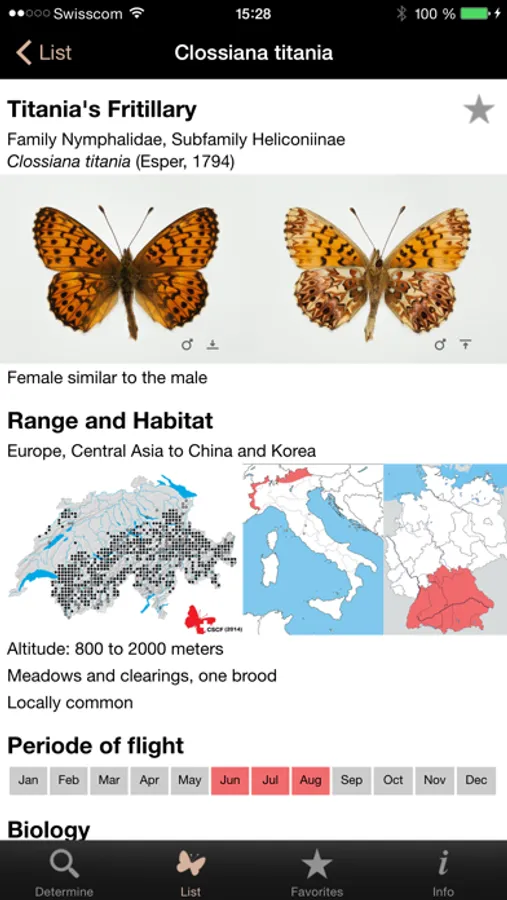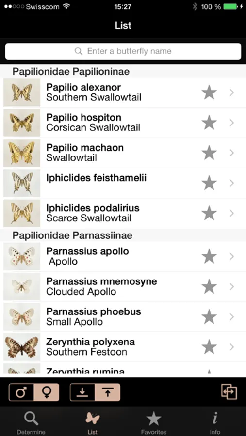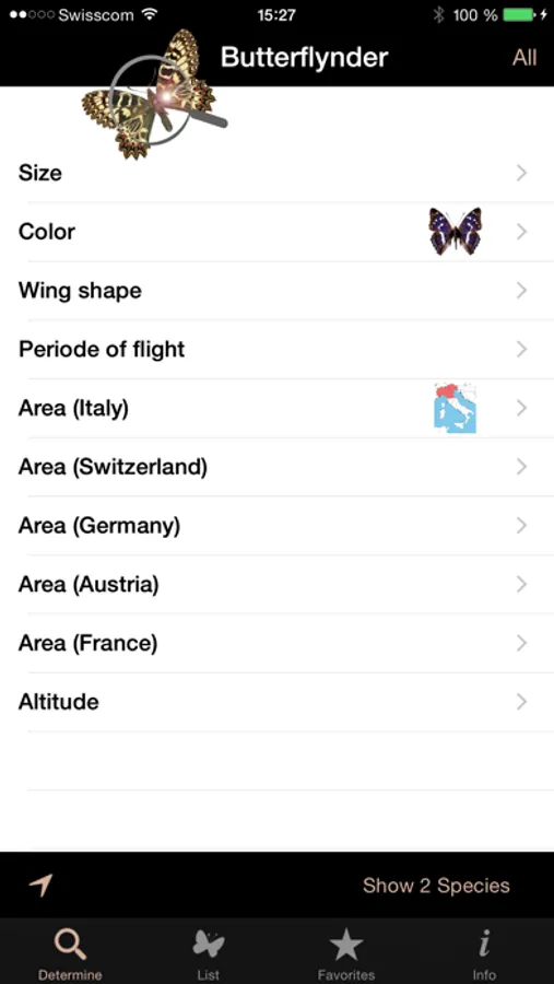 An innovative determination system that allows you to easily identify any observed butterfly: you select the information available for the specimen that you want to identify, as colour, size, date of flight, geographic region, etc. and Butterflynder will show you all the species fitting with the information that you have entered.