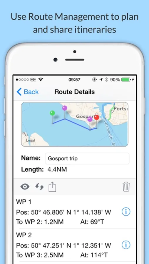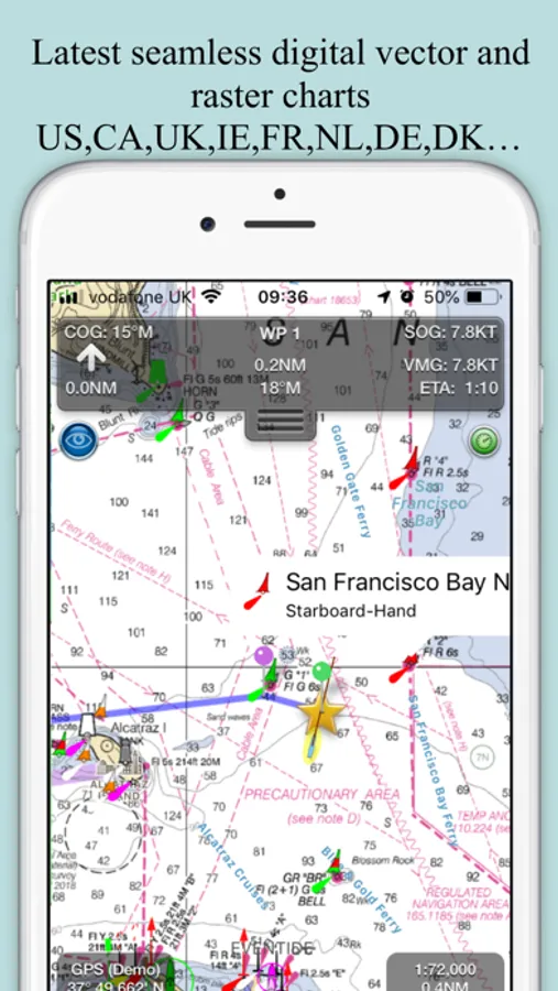 SeaNav lets you measure distances and bearings and record waypoints on routes. When at sea, the app’s Sailing HUD shows your position, Course over ground (COG), Speed over ground (SOG), Vector Made Good (VMG), Estimated Time of Arrival (ETA), Distance and bearing to next Waypoint. Waypoint reached alerts, auto-routing to the next waypoint and collision alerts.