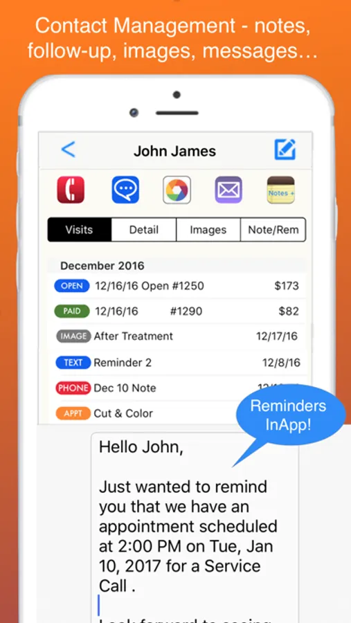 Contact Management - Store notes, images and track other communications with your clients and have the in app ability to call, text, email or map without leaving your app.