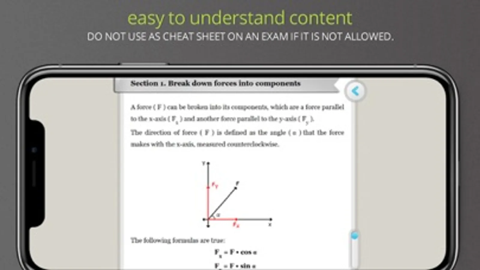 The app features a comprehensive list of formulas for the topics listed bellow, each with a smart formula calculator that allows you to solve any variable within the formula.