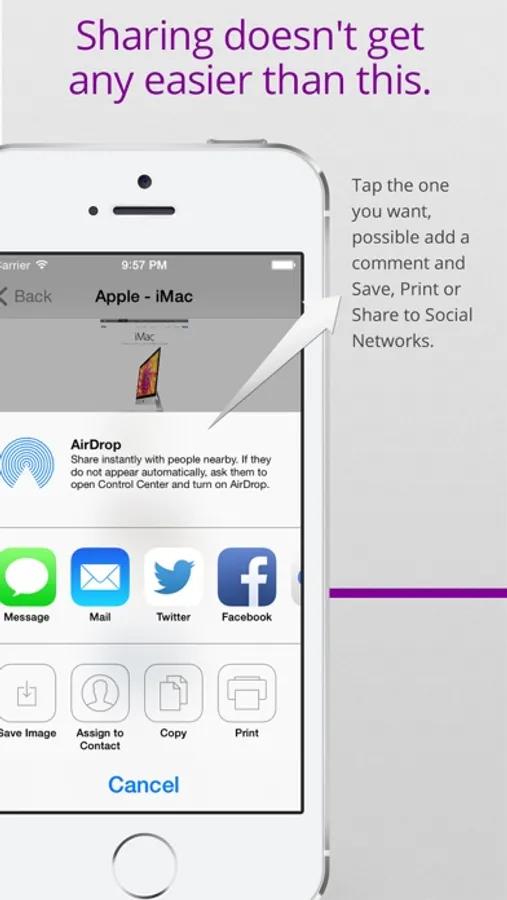 Save to your Camera Roll or the Apps Document folder to View, Edit or share the page at any time to Facebook, Twitter, Flickr, by Email, or Print it and now AirDrop.