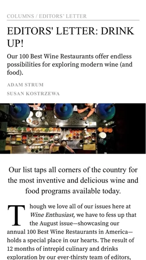 Wine Enthusiast is one of the most respected and quoted authorities in the world of wine and spirits. We feature the hottest trends in everything related to wine. Our seasoned editors do the work for you, with over 700 expert ratings and reviews in each issue. Plus, in-depth features on all aspects of cocktails, spirits, beer, inventive wine and food pairings, trendy recipes, savvy travel features, and more.